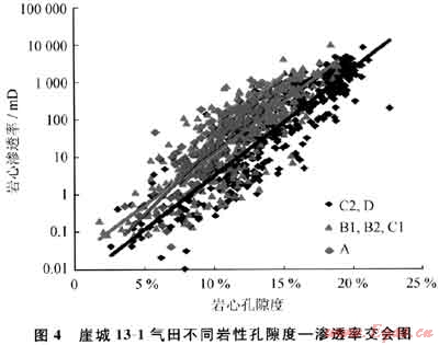 筆者探索了幾種辦法,以減少孔滲關(guān)系圖上點子的分散性。首先,也是最明顯的,就是看巖相對點子的分散性造成了多大的影響,于是,按照巖心地質(zhì)描述得到的巖相作了孔滲關(guān)系圖,發(fā)現(xiàn)每一類數(shù)據(jù)點的分布與其他都不相同,但又有許多重疊部分。因此,即使我們可以從測井曲線中得到巖相的信息,這種方法依然不能精確地用孔隙度來確定滲透率值。