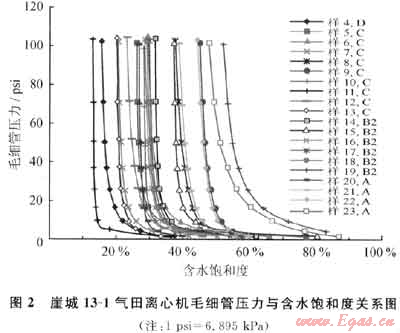 氣田采用低侵巖心Dean-Stark技術(shù)提取的巖心原始地層水礦化度比從Y4井水層測試產(chǎn)的水要淡,這使得在測井解釋中使用的礦化度是否正確成為一個重要問題。此外,嚴(yán)重的鉆井液侵入(探井)及大量巖心測量的電阻率參數(shù)也存在較大差異。這些不確定因素導(dǎo)致在利用模型1)計算含水飽和度時存在許多爭議性的問題,而且該模型無法直接應(yīng)用到地質(zhì)建模及油藏數(shù)字模擬,因此需要建立一個非電法飽和度模型。氣田A1、A2開發(fā)井全井段油基鉆井液密閉心飽和度資料及一定的毛細(xì)管壓力實驗資料為這類模型的研究提供了基礎(chǔ)。但同時又出現(xiàn)了另一個問題,即所有開發(fā)井巖心分析含水飽和度都是束縛水飽和度,因為它們都高于氣水界面,因此在建立非電法模型時需要考慮這些因素。