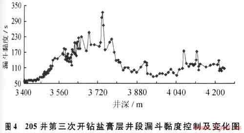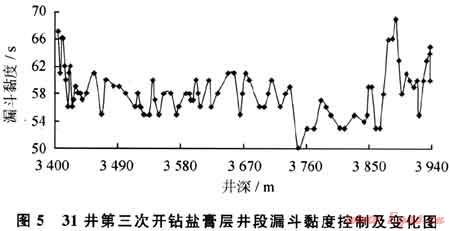 采取的具體措施包括:維持體系較低的堿性(即pH值一般保持在8~9);適當(dāng)放大量以膠液形式補(bǔ)充各類處理劑進(jìn)入體系以維護(hù)鉆進(jìn)過(guò)程中材料的正常消耗;在井漿中不斷補(bǔ)充NaCl甚至到飽和以提高其整體抑制性;補(bǔ)充KCl至一定量以形成對(duì)黏土質(zhì)成分應(yīng)有的抑制效果等。圖5為31井第三次開(kāi)鉆鹽膏層井段漏斗黏度控制及變化情況,由于加強(qiáng)了對(duì)鉆井液整體抑制性的維護(hù),鉆井液流變性能明顯較好。