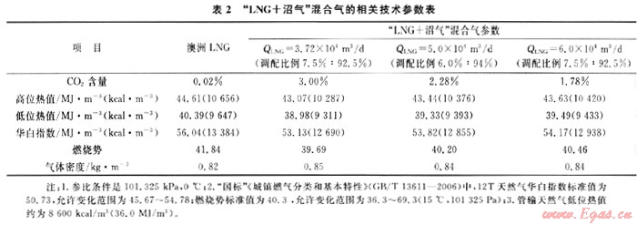 以沼氣產(chǎn)量為3000m3/d時(shí),典型組分的沼氣與澳大利亞LNG氣混配為例,不同比例情況下的“LNG+沼氣”混合氣熱值、C02含量及燃燒特性參數(shù)見表2。