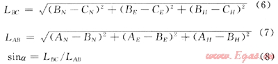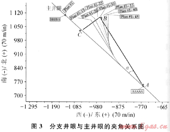 式中AN、AE、AH、BN、BE、BH、CN、CE、CH分別表示A、B、C點在三維空間坐標(biāo)系內(nèi)的坐標(biāo);LBC表示B點到C點的長度;L徹表示A點到8點的長度;a表示分支井眼的側(cè)鉆點與分支井眼終點的連線與主井眼的直線夾角。