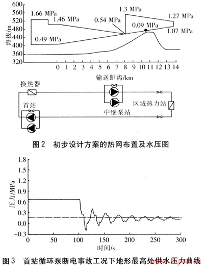 初步設(shè)計(jì)方案考慮控制輸送干線運(yùn)行壓力在1.6MPa以下,在中部設(shè)中繼泵站一座,初步設(shè)計(jì)方案的熱網(wǎng)布置及水壓圖見圖2。