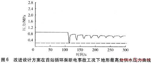 由圖6可知,在首站循環(huán)泵斷電事故工況下,地形最高處的供水壓力高于飽和蒸汽壓力,供熱介質(zhì)不會(huì)發(fā)生汽化。動(dòng)態(tài)水力分析表明,以較高的供水溫度減小供熱介質(zhì)流量,以及提高壓力水平,可以在系統(tǒng)出現(xiàn)事故工況時(shí),保證供熱系統(tǒng)安全運(yùn)行。