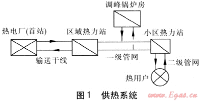 熱源為熱電廠,位于郊區(qū),供熱能力為518MW,熱源出口管道規(guī)格為DN 1000mm。由熱電廠向市區(qū)供熱,輸送干線長度達(dá)到13.6km,且管道通過地區(qū)地形復(fù)雜,最大高差達(dá)到100m以上。為保證熱網(wǎng)安全穩(wěn)定運(yùn)行,提高供熱介質(zhì)的溫度,降低輸送能耗,將熱網(wǎng)分為三級(jí),供熱系統(tǒng)見圖1。輸送干線設(shè)計(jì)供回水溫度為130、70℃,一級(jí)管網(wǎng)設(shè)計(jì)供回水溫度為120、65℃,二級(jí)管網(wǎng)設(shè)計(jì)供回水溫度為85、60℃。供熱輸送干線距離長、管徑大、壓力、溫度較高,對(duì)可靠性要求較高。因此,在方案設(shè)計(jì)上,除了靜態(tài)水力分析合理可行外,還應(yīng)進(jìn)行動(dòng)態(tài)水力分析,避免出現(xiàn)重大事故。