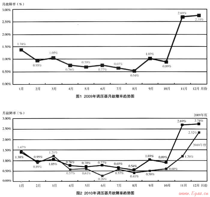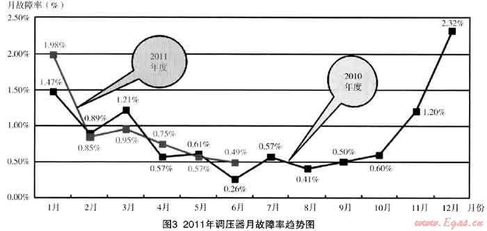 以下是2009年~2011年6月調(diào)壓器故障率的統(tǒng)計(jì)數(shù)據(jù):(如圖1~圖3)西安因冬季采暖鍋爐客戶較多,每年用氣波峰比為4:1,冬季由于上游的原因,經(jīng)常出現(xiàn)供不應(yīng)求的現(xiàn)象,中壓管網(wǎng)的供氣壓力和流量達(dá)不到設(shè)計(jì)要求,處于低壓高流速的運(yùn)行狀態(tài),管道內(nèi)的粉塵會(huì)被帶到下游,對(duì)調(diào)壓器的正常運(yùn)行帶來一定的影響。故公司在設(shè)定調(diào)壓器故障率KPI指標(biāo)時(shí),對(duì)冬季高峰供氣期間與平時(shí)有所不同,即每年4月~10月調(diào)壓器故障率不大于1.5%,11月~次年3月調(diào)壓器故障率不大于3%。