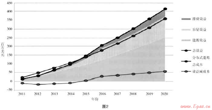 圖2中表示在2011到2014年的最初幾年DER的成本大于效益,但2015年以后效益大于成本。在最初幾年DER總量較小,其潛在的優(yōu)勢,包括財政優(yōu)惠的作用都未能充分顯現(xiàn)出來,但2014年后隨著DER容量加大的規(guī)模效益和政策、市場、技術(shù)的發(fā)展,效益逐步超過了成本。