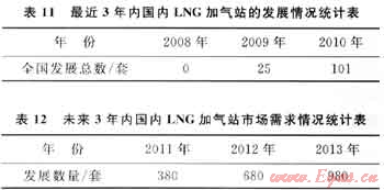 對(duì)LNG燃料汽車發(fā)展進(jìn)度影響最大的是配套LNG加氣站的建設(shè)。目前,我國(guó)3大能源企業(yè)(中石油、中石化、中海油)及新疆廣匯、新奧燃?xì)?、中?guó)港華燃?xì)?、華潤(rùn)燃?xì)獾纫慌鞠嗬^進(jìn)入了LNG替代汽柴油用于新能源汽車的研究領(lǐng)域,并相應(yīng)作出了3~5年建設(shè)LNG汽車加氣站、生產(chǎn)LNG公交汽車和重型卡車的規(guī)劃。表11、12分別是最近3年內(nèi)國(guó)內(nèi)LNG加氣站的發(fā)展情況及未來3年的市場(chǎng)需求情況統(tǒng)計(jì)[5]。