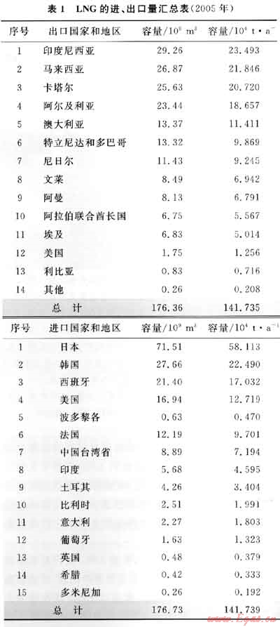 2003年全球天然氣消費(fèi)量為2.6×1012m3/a,至2006年持續(xù)以1.8%的比例增加,其后又以每年2.8%的比例增長(zhǎng),預(yù)計(jì)2025年全球天然氣消費(fèi)量將達(dá)5.1×1012m3/a。在天然氣貿(mào)易量中有7%是通過LNG的方式來進(jìn)行的,表1反映了世界LNG進(jìn)出口國(guó)家和地區(qū)的進(jìn)出口量[1]。