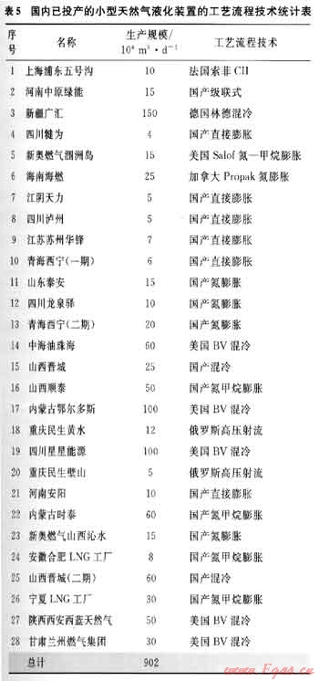 我國(guó)已建成投產(chǎn)的LNG工廠中,一部分采用了國(guó)外的流程工藝技術(shù),如美國(guó)的B&V、Salof、ACPI,法國(guó)的Sole,德國(guó)的Linde等;另一部分則采用了國(guó)內(nèi)自行開發(fā)的技術(shù),如河南中原綠能高科有限責(zé)任公司、成都深冷空分設(shè)備工程有限公司、中國(guó)科學(xué)院理化技術(shù)研究所等的流程工藝。目前,國(guó)產(chǎn)液化工藝包日趨成熟,單條生產(chǎn)線的規(guī)??蛇_(dá)60×104m3/d(LNG年產(chǎn)量為16×104t)。國(guó)內(nèi)已投產(chǎn)的小型天然氣液化裝置的工藝流程技術(shù)統(tǒng)計(jì)情況如表5所示[4]。