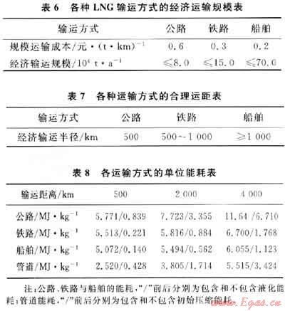 根據(jù)相關(guān)資料測(cè)算,得到各種運(yùn)輸方式在不同運(yùn)輸距離下,輸送單位質(zhì)量LNG的一次能源(換算成天然氣)消耗量如表8所示[4]。