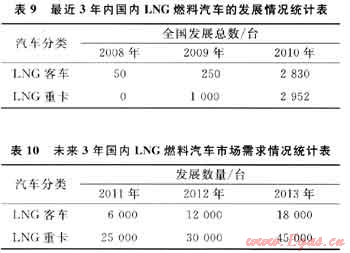 近年來,我國(guó)LNG燃料汽車已進(jìn)入了快速發(fā)展通道,在短短的3年時(shí)間內(nèi),國(guó)內(nèi)已經(jīng)有新疆、山西、內(nèi)蒙古等地的LNG重型卡車及北京、杭州、深圳、烏魯木齊、昆明、??凇⒄拷?、張家口等城市LNG公交相繼投入了運(yùn)行,而且這一城市群體還在迅速擴(kuò)大,充分說明了LNG燃料汽車的技術(shù)已經(jīng)完全成熟、節(jié)能減排優(yōu)勢(shì)明顯。表9、10分別反映了最近3年內(nèi)國(guó)內(nèi)LNG燃料汽車的發(fā)展情況及未來3年汽車市場(chǎng)需求情況[5]。