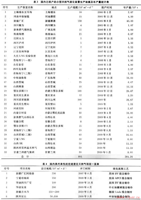 近年來我國(guó)小型LNG工廠發(fā)展迅速,截止到2010年1月,我國(guó)已經(jīng)運(yùn)營(yíng)的小型LNG裝置有30多座。這些小型LNG工廠分布在新疆、四川、江蘇、山東、山西、廣東、內(nèi)蒙古等省區(qū),總規(guī)模近1000×104m3/d,年產(chǎn)量超過260×104t。國(guó)內(nèi)I.NG工廠一覽表如表3、4所示[4]。