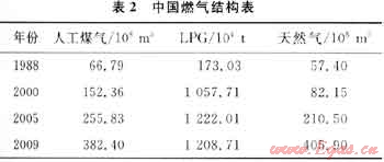 我國(guó)將天然氣發(fā)展視為一項(xiàng)能源結(jié)構(gòu)調(diào)整和大氣環(huán)境改善的重要舉措。中國(guó)城市燃?xì)膺M(jìn)入了天然氣階段,20世紀(jì)90年代末至21世紀(jì)初,中國(guó)建設(shè)了一批天然氣輸送工程,推動(dòng)了城市燃?xì)獾陌l(fā)展——城市燃?xì)馄占奥侍岣摺⑷細(xì)饨Y(jié)構(gòu)發(fā)生了很大變化(表2)[3]。
