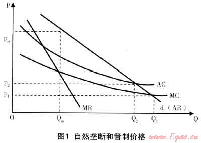 如圖1所示,其中,P表示價格,Q表示產(chǎn)量,d表示需求曲線。在市場上只有一家供貨者來說,市場需求曲線等于單個壟斷廠商所面臨的需求曲線。當(dāng)價格下降時(同時其他條件不變),市場上對產(chǎn)品的需求是增加的。在無管制的情況下,壟斷企業(yè)根據(jù)MR(邊際收益)=MC(邊際成本)的原則確定的產(chǎn)量為Qm,價格為Pm,價格顯然高于邊際成本,此時壟斷企業(yè)利潤最大化。在政府管制的情況下,按照邊際成本定價法即P=MC,企業(yè)的價格下降為P1,產(chǎn)量增加為Q1。但隨之而來的問題是,由于自然壟斷廠商是在AC曲線下降的規(guī)模經(jīng)濟(jì)段進(jìn)行生產(chǎn),所以,MC曲線位于AC曲線的下方。即是說,按照邊際成本MC所決定的價格P1一定小于平均成本AC。因此,在這種情況下,企業(yè)是虧損的,企業(yè)會退出生產(chǎn),或者犧牲必需的成本來降低平均成本,但會降低服務(wù)質(zhì)量。