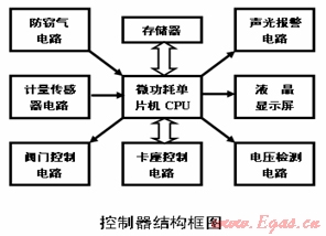 2、控制器:控制器一般由計(jì)量傳感器電路、微功耗單片機(jī)、微功耗閥門、電壓測試電路、防竊氣電路等部分組成(如圖所示)。具有精確記數(shù)功能、功能卡傳輸媒介功能、閥門自動處理功能、非法操作處理功能、欠壓處理功能、掉電處理功能、數(shù)據(jù)下載功能、數(shù)據(jù)顯示與聲音提示功能等。采用單片機(jī)對傳感器的脈沖進(jìn)行計(jì)量、分析處理,并驅(qū)動相應(yīng)的部件進(jìn)行控制。主要包括CPU、讀寫卡接口、顯示、計(jì)數(shù)等輔助部件,是IC卡燃?xì)獗淼暮诵脑O(shè)備。
