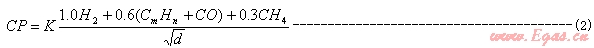 與德?tīng)柌脊?span>(1)相比:K相當(dāng)于U;H2與CH4前的系數(shù)相同;CO前的系數(shù)取0.6也符合德?tīng)柌嫉膶?shí)驗(yàn)。當(dāng)時(shí)我國(guó)人工氣中CO含量高,但CO含量高,不符合煤制氣質(zhì)量的在安全方面要求,故取0.6 比較合適。再看CmHn前的系數(shù),公式(2)就簡(jiǎn)單化了,不適合CnHn含量高的燃?xì)?。為此編制組作過(guò)對(duì)比計(jì)算,結(jié)論是對(duì)人工氣與天然氣(1)、(2)式相差較小,對(duì)液化石油氣相差較大,故直接取C3H8、 C4H10 、液化石油氣混空氣的CP值為48.2、41.5、46。這樣看來(lái),編制組采用公式(2)也是根據(jù)計(jì)算,經(jīng)過(guò)分析確定的[9]。由于公式(2)比較簡(jiǎn)單易算。當(dāng)時(shí)沒(méi)有條件做實(shí)驗(yàn)驗(yàn)證工作,于是得到代表們的認(rèn)同。