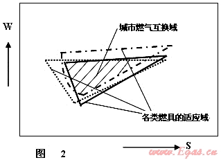 2. 城市燃?xì)饣Q域:一個(gè)城市有多種不同用途的燃具。每種燃具都有自己的燃具適應(yīng)域。將這些適應(yīng)域,集中在一個(gè)坐標(biāo)圖上(見(jiàn)圖2),就可以得到中間斜線的燃?xì)饣Q域。城市供應(yīng)的燃?xì)獗仨氃谶@些燃具的適應(yīng)域的范圍內(nèi)。可見(jiàn)燃?xì)饣Q域是受燃具適應(yīng)域制約的。其實(shí)互換性和適應(yīng)性的目的都是保證燃具正常工作,是一個(gè)事物的兩個(gè)方面?;Q性是對(duì)城市燃?xì)庹f(shuō)的;適應(yīng)性是對(duì)燃具說(shuō)的。在討論時(shí)不要混淆。