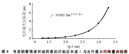 2) 根據(jù)《輸氣管道工程設(shè)計規(guī)范》[3]的有關(guān)規(guī)定,在輸氣管道系統(tǒng)中,支管道沒有軸向約束(如固定支墩或其他錨固件)時,使管道附件產(chǎn)生的彎曲應(yīng)符合公式:σe≤0.72σs(σe為組合應(yīng)力;σs為管道的最低屈服強(qiáng)度),按假設(shè)受力模型的簡化分析和采用的算例,X70鋼管屈服強(qiáng)度為485MPa,則0.72σs=349.2MPa,可得管道通過不同長度沉陷區(qū)的允許最大沉陷量和其回歸方程(圖8)。
