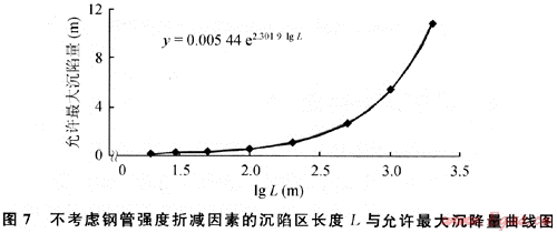 1) 按假設(shè)受力模型的簡化分析和所采用的計算方法,X70鋼管屈服強(qiáng)度為485MPa,并以此作為管道遭遇危險的判定標(biāo)準(zhǔn),在不考慮鋼管強(qiáng)度的折減因素前提下,可得管道通過不同長度沉陷區(qū)的允許最大沉降量,并用最小二乘法建立了管道允許最大沉陷量與沉陷區(qū)長度的回歸方程,結(jié)果如圖7所示。