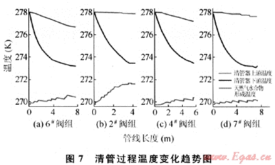 分析,獲取了清管后各閥組管線恢復(fù)穩(wěn)態(tài)的時間。采用瞬態(tài)分析方法對清管器運行中溫度變化研究的結(jié)論表明:各閥組在清管過程中沒有天然氣水合物的形成。進一步驗證了清管節(jié)流理論的正確性。