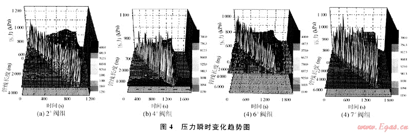 各閥組由于地形變化起伏大,壓力波動隨著管線的起伏也發(fā)生了較大的變化(見圖4)。從圖中可以看到壓力波動的位置出現(xiàn)在段塞出現(xiàn)處和管線走向發(fā)生改變的地方。在通球過程中各閥組流體壓力變化具有共同的特征:當(dāng)清管器放入管道后,由于清管器后部流體被阻,上游氣體被壓縮使清管器上游壓力急劇升高,清管器運動后,上游重新恢復(fù)到新的穩(wěn)態(tài);清管器下游由于流體連續(xù)性的中斷,開始時下游流體壓力急劇下降,清管器經(jīng)過后,由于氣體得以補充,原下游下降的壓力開始上升。清管器剛經(jīng)過時,在清管器上游一定長度的管段內(nèi)幾乎沒有液體存在,使清管器上游壓力幾乎相等,僅由于阻力損失使壓力出現(xiàn)微小的差別;當(dāng)清管操作完成后,各管段經(jīng)過一段時間重新達到了新的穩(wěn)態(tài)。