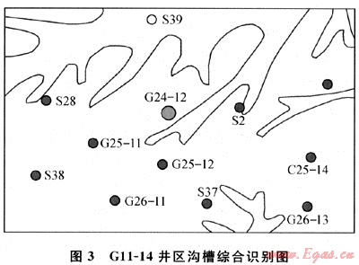 中部氣田溝槽比較發(fā)育,不同級(jí)次規(guī)模的樹枝狀溝槽網(wǎng)絡(luò)空間分布復(fù)雜[11]。由于溝槽對(duì)儲(chǔ)層形成切割和側(cè)向封擋,會(huì)形成明顯的流體滲流邊界。在64口井的測(cè)試分析中,有14口井(S3、G24-12、G109、S61、S11、S181、S150、S76、S74、G17-13、G45-6、G23-18、G25-11和G32-4井)表現(xiàn)出了明顯的滲流邊界特征,占總井?dāng)?shù)的21.9%。其中,具有平行邊界的井11口,具有開口邊界的井3口(S3、G24-12和G10-9井),這些井外邊界的分析情況大部分與地質(zhì)上劃定的溝槽相吻合。如G24-12井,2001年3月6日進(jìn)行了為期31d的壓力恢復(fù)測(cè)試,實(shí)測(cè)數(shù)據(jù)導(dǎo)數(shù)曲線的末端持續(xù)上翹,其斜率在1/2和1之間,判斷這應(yīng)是三面封閉一端開口的“坑道”模型的反映。選用該模型進(jìn)行擬合,效果很好。通過地質(zhì)和地震資料進(jìn)行的溝槽識(shí)別結(jié)果(圖3)也證明了這一點(diǎn),即G24-12井不但在其北方有一條一級(jí)溝槽,而且在其東邊和西邊還分別受到兩條二級(jí)溝槽的“挾持”。