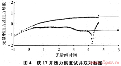陜17井的雙對(duì)數(shù)分析圖(圖4)中實(shí)測(cè)壓力導(dǎo)數(shù)曲線在壓力恢復(fù)的晚期急劇下掉,分析形成該現(xiàn)象的原因在理論上,一是定壓邊界,二是圓形或矩形封閉邊界。但研究該井的壓力恢復(fù)歷史數(shù)據(jù)發(fā)現(xiàn)關(guān)井恢復(fù)到500h之后壓力不升反降,因此,確定這是由于鄰井生產(chǎn)造成的。這樣的井還有G12-5、G34-2、G18-9和G23-2等,這種不穩(wěn)定晚期受到鄰井干擾的情況基本得到了證實(shí)。