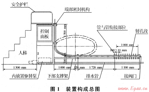為了能進(jìn)行連續(xù)油管在水平井井筒中對(duì)替液、沖砂、孔眼分流等模擬研究,預(yù)期研制成的模擬裝置能達(dá)到以下主要功能:①能模擬川渝氣區(qū)主要水平井的井眼特征;②能模擬工作液在連續(xù)油管入井后的流動(dòng)狀態(tài),并具有可視化功能,便于觀察和拍攝;③能開展連續(xù)油管作業(yè)時(shí),工作液的孔眼分流模擬實(shí)驗(yàn);④能開展運(yùn)用連續(xù)油管進(jìn)行替液、沖砂、攜砂等模擬實(shí)驗(yàn)研究[1~3]。