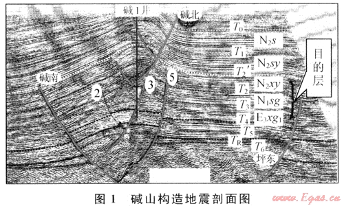 堿山構(gòu)造新近系自晚燕山運動以來,先后經(jīng)歷了多次喜山運動[7]。強烈的擠壓構(gòu)造運動,一方面在本區(qū)形成了背斜構(gòu)造,為天然氣的聚集提供了可能的場所,但另一方面構(gòu)造運動形成的斷裂,會破壞構(gòu)造的完整性,將構(gòu)造分割成不同的斷塊,不利于天然氣的聚集,其中堿北斷裂斷至地表,對成藏極為不利。堿山構(gòu)造淺層與深層以T3為界分成兩部分,深層構(gòu)造受早期高角度逆沖斷層控制,在剖面上表現(xiàn)為兩斷夾一隆基底卷入型構(gòu)造樣式;淺層構(gòu)造受淺層滑脫斷層即堿北斷層控制,形成蓋層滑脫型構(gòu)造樣式(圖1)。