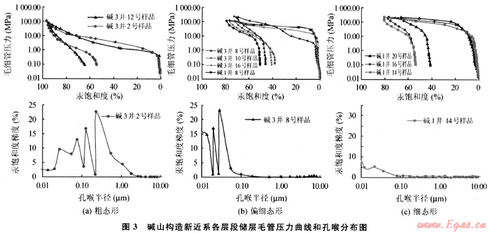 儲層孔隙結(jié)構(gòu)分為粗態(tài)型、偏細態(tài)型和細態(tài)型3種類型,整體排驅(qū)壓力較高(圖3),儲層主要流動喉道半徑較小,喉道孔徑主要分布在小于0.1μm的范圍,屬小孔-微細喉型,喉道系統(tǒng)較復(fù)雜,均勻程度差,分選不好,孔喉比大,喉道相當(dāng)彎曲,因而排驅(qū)壓力和飽和度中值壓力高,退出效率低,充分表明儲層孔隙結(jié)構(gòu)差,故儲層滲透能力差,為差儲集層,不利于油氣的運聚。從縱向上整體來看滲流能力由上向下逐漸變差(表2)。根據(jù)裘亦楠、王允誠等確定的砂巖儲層分類評價方案所示,表明堿山構(gòu)造各儲層屬Ⅱ3-Ⅳ類儲層,即中下等到很差-差類儲層,這也是該區(qū)沒有形成規(guī)模聚集的主要原因之一[8~9]。