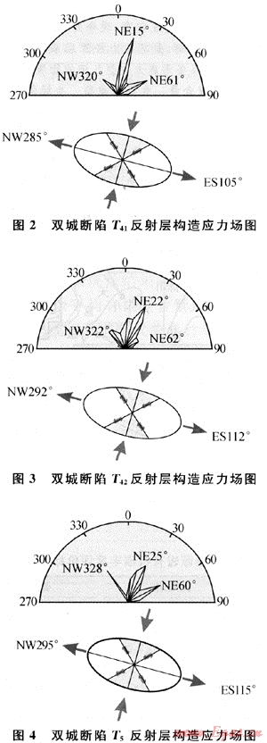 通過(guò)上述方法的研究分析后認(rèn)為:①雙城斷陷伸展時(shí)期原始邊界主斷層走向?yàn)镹NE15°~25°;②兩個(gè)共軛張扭斷層(走滑斷層)方向分別為NEE60°~62°和NW320°~328°;③雙城斷陷火石嶺組營(yíng)城組火山巖段沉積時(shí)期構(gòu)造應(yīng)力場(chǎng)為主張應(yīng)力,方向?yàn)镹W(285°~295°)-SE(105°~115°),主壓應(yīng)力方向:NE(15°~25°)-SW(185°~205°)。