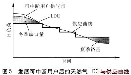 通過(guò)市場(chǎng)手段來(lái)減少城市天然氣冬季缺口量是燃?xì)馄髽I(yè)的常用做法[3],即發(fā)展季節(jié)可中斷用戶。通過(guò)季節(jié)可中斷用戶用氣量的調(diào)節(jié),使冬季缺口量減少(即LDC的最高點(diǎn)降低,見(jiàn)圖5),減少了補(bǔ)充氣源在供氣高峰時(shí)的日供應(yīng)量,從而降低相應(yīng)的工程設(shè)施造價(jià)及其運(yùn)行管理費(fèi)用。