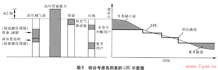 圖6的右邊反映出在照付不議供氣合同氣量與市場(chǎng)需求不一致的情況下,可能出現(xiàn)的冬季缺口量和夏季裕量,以及春秋季節(jié)某些天的供需不平衡,利用LDC有助于規(guī)劃各類氣源供應(yīng)以及市場(chǎng)發(fā)展策略。在圖6的左邊,有市場(chǎng)、資源、高壓管輸能力和高壓儲(chǔ)氣量4根柱狀圖。高壓儲(chǔ)氣量柱狀圖顯示:球罐和管束等對(duì)儲(chǔ)氣壓力有調(diào)節(jié)手段,能應(yīng)付變化幅度較大的調(diào)峰,對(duì)應(yīng)右邊LDC腰部的位置;高壓輸氣管道只有小時(shí)調(diào)峰能力而無(wú)季節(jié)調(diào)峰能力。高壓管輸能力柱狀圖比LDC最高點(diǎn)高出0.2倍,是提醒設(shè)計(jì)時(shí)應(yīng)考慮管輸能力比年最大用氣量目的用氣需求負(fù)荷高20%。資源柱狀圖表示解決冬季缺口量所需的工程手段,即補(bǔ)充氣源設(shè)施規(guī)劃。若冬季缺口量全部由工程手段解決將會(huì)使補(bǔ)充氣源設(shè)施龐大,造價(jià)高,且補(bǔ)充氣源全成本較高也會(huì)增加燃?xì)馄髽I(yè)的運(yùn)行費(fèi)用。因此,應(yīng)從需求側(cè)(市場(chǎng))做出規(guī)劃,即大力發(fā)展季節(jié)可中斷用戶,謹(jǐn)慎發(fā)展壁掛爐用