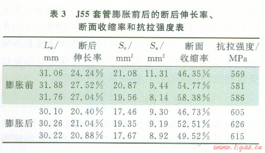 按照國標GB/T 228 2002,從膨脹前后的J55套管中各自截取3個拉伸試樣。根據(jù)金屬材料室溫拉伸標準GB/T 228--2002,試樣的原始標距根據(jù)L0=