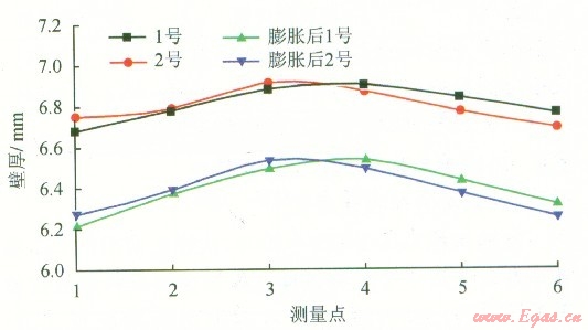 說明外徑的變化比例要小于壁厚的變化比例,即不均勻變形程度越小。據(jù)計算,1號、2號套管膨脹后的Q值分別為0.88、0.89,即l號套管的不均勻變形程度稍大于2號套管,也可以說明適當?shù)臐櫥怯兄谔坠茉谂蛎涍^程中的均勻變形。