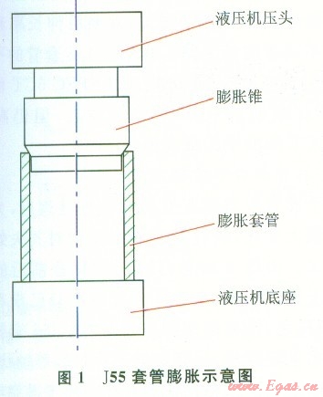 本試驗選用模具鋼Crl2MoV作為膨脹錐的材料,自主設計并加工膨脹錐用于J55套管的膨脹。試驗采用自上而下的膨脹方式,通過YQ41單臂液壓機完成J55套管的膨脹,如圖l所示,液壓機的底座固定,壓頭向下施加與膨脹套管軸向一致的載荷,膨脹錐在導向區(qū)段的引導下緩慢進入套管,套管在巨大的接觸應力下開始膨脹。在膨脹試驗前,對2號套管進行潤滑處理,1號套管則沒有,只清除管壁內的雜質。