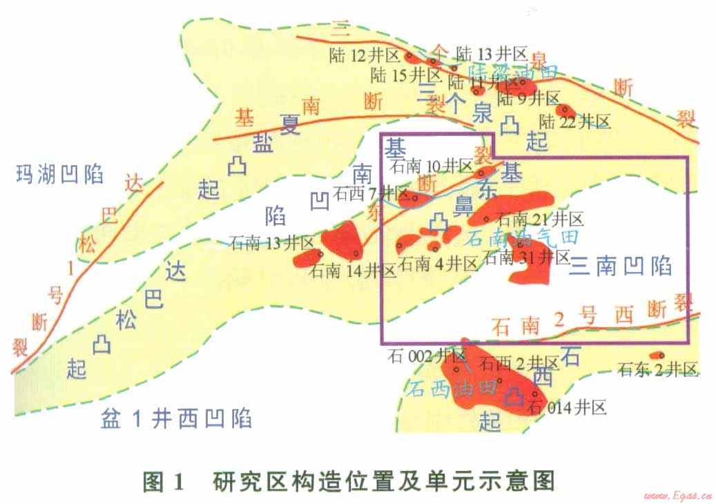研究區(qū)位于準(zhǔn)噶爾盆地腹部陸西地區(qū)(圖1中紫紅色框范圍),西接基東鼻狀凸起,北鄰三個(gè)泉凸起,東南靠三南凹陷。