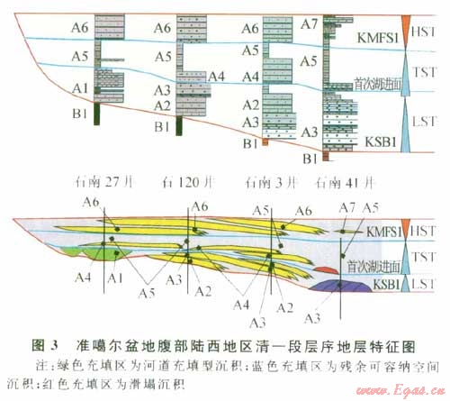 細(xì)的河道型沉積,緊鄰A3之上發(fā)育一套薄泥巖,在電阻率曲線上顯示一個(gè)明顯的低阻特征,指示首次大規(guī)模的湖進(jìn)面。水進(jìn)體系域以正常河流三角洲沉積(A4)體系為主,隨后發(fā)育了以粉砂巖為主的砂泥巖薄互層沉積(A5),顯示湖平面上升早中期的垂向加積為主的沉積特征,在A5之上發(fā)育薄的質(zhì)純高伽馬值泥巖,指示最大湖泛面位置KMFS1(也是一個(gè)下超面和視不整合面),上覆高含砂率的巖性組合(A6)指示高位體系域的進(jìn)積沉積體系[3]。