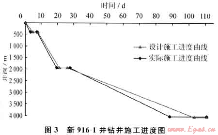 從本井時(shí)效分析結(jié)果可知,全井鉆井總臺(tái)時(shí)為2121.5h,臺(tái)月效率為1366.10m/臺(tái)月,高于設(shè)計(jì)值15.94%;純鉆率為57.31%,高于沒計(jì)值15.26%;全井平均鉆速為3.31m/h,高于設(shè)計(jì)值0.61%。事故率為0,鉆井周期為88.4d,平均機(jī)械鉆速為3.31m/h,實(shí)現(xiàn)了以須四段為目的層的4000m定向深井105d完鉆的提速奮斗目標(biāo),并較提速目標(biāo)提前16.60d,創(chuàng)造了川西地區(qū)4000m定向深井鉆井周期最短紀(jì)錄(施工進(jìn)度如圖3所示)。