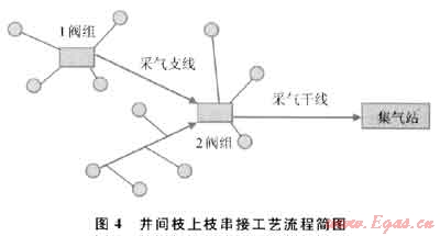 首次在煤層氣氣田工程中采用了多種井間串接方式,單井不必直接敷設(shè)進(jìn)站,而是根據(jù)地形、地貌、井型等情況,通過采氣支管把相鄰的幾口氣井靈活串接到采氣干管,匯合后集中進(jìn)站。這種井間枝上枝的串接工藝縮短了采氣管線長(zhǎng)度,增加了集氣站的集氣半徑,降低了管網(wǎng)投資,減少了對(duì)植被的破壞,提高了采氣管網(wǎng)對(duì)氣田滾動(dòng)開發(fā)的適應(yīng)性。圖4為井間枝上枝串接工藝流程簡(jiǎn)圖。