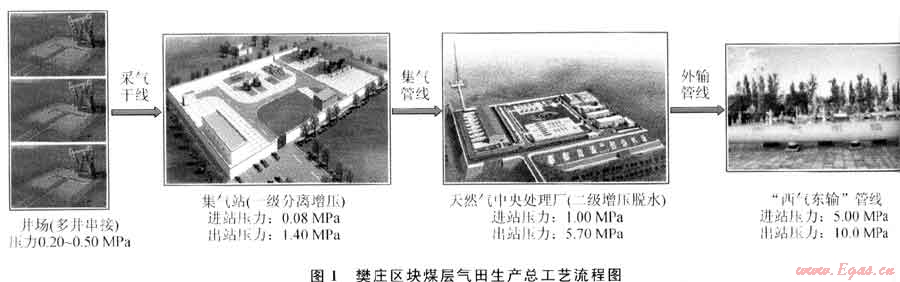 根據(jù)國(guó)家大力發(fā)展新能源的戰(zhàn)略要求,“十一五”期間中國(guó)石油天然氣股份有限公司在山西沁水盆地樊莊區(qū)塊開始規(guī)模開發(fā)煤層氣田,該區(qū)域位于山西省東南部、太行山西麓沁水盆地南部,行政隸屬于山西省晉城市沁水縣。樊莊區(qū)塊煤層氣田產(chǎn)能建設(shè)目標(biāo)為6.0×108m3/a,地面系統(tǒng)共建采氣井400余口、集氣站6個(gè),天然氣中央處理廠一期建設(shè)規(guī)模為10×108m3/a。2009年9月15日,天然氣中央處理廠產(chǎn)品氣開始源源不斷地輸送至“西氣東輸”管網(wǎng),樊莊區(qū)塊煤層氣田6.0×108m3/a產(chǎn)能建設(shè)完成,我國(guó)第一個(gè)規(guī)?;_發(fā)、商業(yè)化運(yùn)營(yíng)的煤層氣示范工程進(jìn)入試生產(chǎn)階段。圖1為樊莊區(qū)塊煤層氣田生產(chǎn)總工藝流程圖。