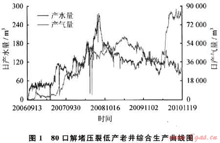 針對(duì)煤層氣排采過(guò)程中煤層滲透性低、易造成煤粉堵塞的情況,為恢復(fù)儲(chǔ)層滲透性、提高低效井單井產(chǎn)量,開展了低產(chǎn)井大液量、高排量壓裂增產(chǎn)技術(shù)。特別是2008年以來(lái),針對(duì)不同的傷害原因,結(jié)合煤巖結(jié)構(gòu)特征,開展了不同規(guī)模的二次重復(fù)壓裂試驗(yàn)研究,逐步發(fā)展完善形成了自己特有的二次壓裂解堵性壓裂增產(chǎn)技術(shù)。該技術(shù)可有效清除近井地帶的煤粉沉積、改善因應(yīng)力變化而發(fā)生變形或者閉合的微孔隙,重新建立起與遠(yuǎn)端溝通的通道;同時(shí)還可有效地解除氣鎖和膠結(jié)的煤粉的影響,防止煤層的進(jìn)一步垮塌。2009年底至2010年規(guī)模實(shí)施二次壓裂解堵井80口(圖1),平均單井日增產(chǎn)1000m3左右。目前煤層氣解堵性壓裂工藝技術(shù)已經(jīng)從局部實(shí)驗(yàn)階段走向全面現(xiàn)場(chǎng)應(yīng)用階段,具有較強(qiáng)的適應(yīng)性和針對(duì)性,取得了較好的增產(chǎn)效果和可觀的經(jīng)濟(jì)效益。