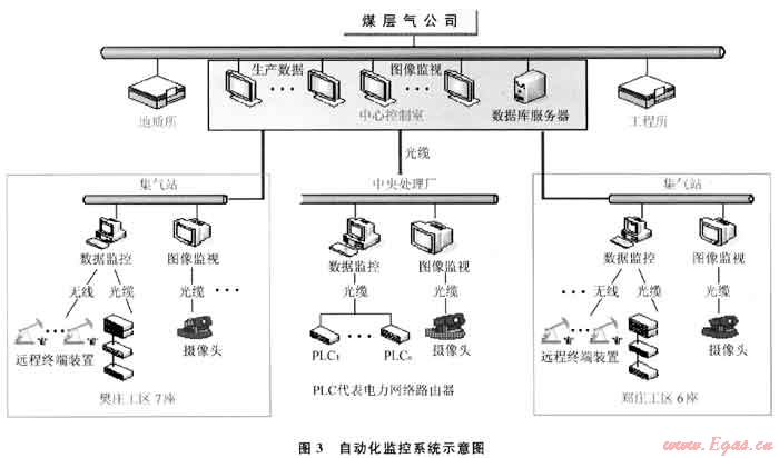 采用SCADA系統(tǒng)對(duì)全區(qū)生產(chǎn)運(yùn)行分單井-集氣站-處理中心3級(jí)監(jiān)控和運(yùn)營(yíng)管理(圖3),集氣站采用以計(jì)算機(jī)控制技術(shù)為核心的站控系統(tǒng)(SCS),完成站場(chǎng)內(nèi)工藝過(guò)程的數(shù)據(jù)采集和監(jiān)控任務(wù),采氣井場(chǎng)設(shè)置SCADA系統(tǒng)遠(yuǎn)程終端裝置(RTU),將井口數(shù)據(jù)通過(guò)無(wú)線寬帶+光纜傳輸?shù)姆绞絺髦翑?shù)據(jù)中心。實(shí)現(xiàn)了生產(chǎn)管理的智能化,減少了30%的用工總量,保障了系統(tǒng)平穩(wěn)運(yùn)行,提高了管理水平和工作效率。
