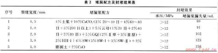 通過(guò)材料優(yōu)選確定以GQJ-Ⅱ型、GQJ-Ⅲ型為主要架橋材料,SW-Ⅰ、SW-Ⅱ?yàn)槔w維材料,不同粒徑的CaC03和云母作為片狀填充材料,并配合高失水劑HH-1及無(wú)機(jī)鹽Ca0,根據(jù)Howard和Scott的SAN-2工程分布理論[11]確定了各種材料的粒徑級(jí)配,形成抗高溫堵漏配方,并用堵漏儀對(duì)0.5~4mm之間的縫板進(jìn)行承壓堵漏效果評(píng)價(jià)。試驗(yàn)數(shù)據(jù)見(jiàn)表2,通過(guò)實(shí)驗(yàn)數(shù)據(jù)可以看出,不同縫寬下承壓能力均高于12MPa。