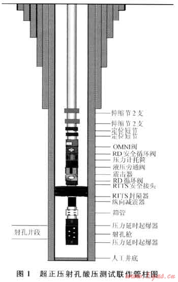 超正壓射孔酸壓測試管柱如圖1所示,主要用于射孔后立即進行改造的儲層,一般是儲層物性較好、通過改造可獲得理想產(chǎn)能的儲層。充分利用超正壓射孔產(chǎn)生的高壓聚能流體對地層形成的微裂縫,降低注酸初始壓力。該三聯(lián)作工藝,不僅能縮短施工周期、成果見效快、有效降低測試成本,而且能減少射孔后壓井液對地層的二次污染。